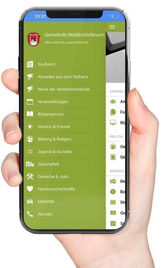 Einfach downloaden und los geht’s. In der Gemeinde Waldbüttelbrunn – App finden Sie alles auf einen Klick: Dienstleister, Müllplan, Gesundheitsversorgung, Apothekennotdienst, Straßenplan, Schulen und Kindergärten, Übersicht der Vereine, Schadensmelder, ÖPNV-Fahrplan und vieles mehr. Mit PUSH-Nachrichten sind Sie immer auf dem aktuellen Stand.